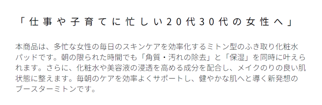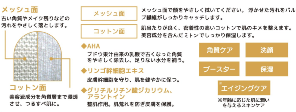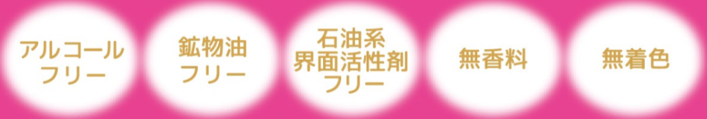 | 成分 | 水、イソペンチルジオール、BG、コハク酸ジエトキシエチル、乳酸桿菌/ブドウ果汁発酵液、ヒアルロン酸Na、アラントイン、グリチルリチン酸2K、ラベンダー花エキス、センチフォリアバラ花水、アロエベラ葉エキス、イヨカン果皮エキス、リンゴ果実培養細胞エキス、キサンタンガム、グリセリン、レシチン、ラウラミドプロピルベタイン、ヒドロキシエチルセルロース、フェノキシエタノール、メチルパラベン、クエン酸Na |